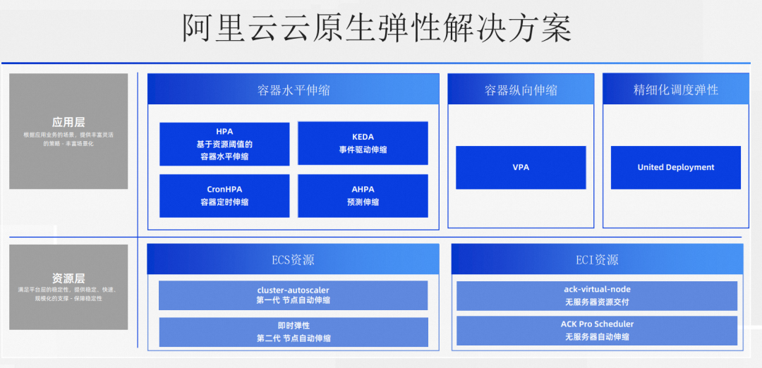 明确了弹性的目标后,那我们下面具体看看阿里云容器服务各维度提供了哪些弹性解决方案。
