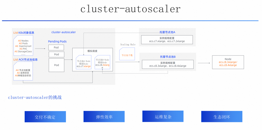 同时对很多应用和工作负载来说这套机制都运行的不错。但是随着更多的用户上云,ACK 也被更广泛地使用,用户正在将各种不同类型的工作负载转移到 ACK上,也就对基于依赖全集群状态维护和 One Nodepool One Virtual Node 的 cluster-autoscaler 的这套机制引入了更多的挑战。主要集中在:交付资源不完全确定、弹性效率受集群规模和业务类型发散度大、运维复杂和生态闭环这几点。