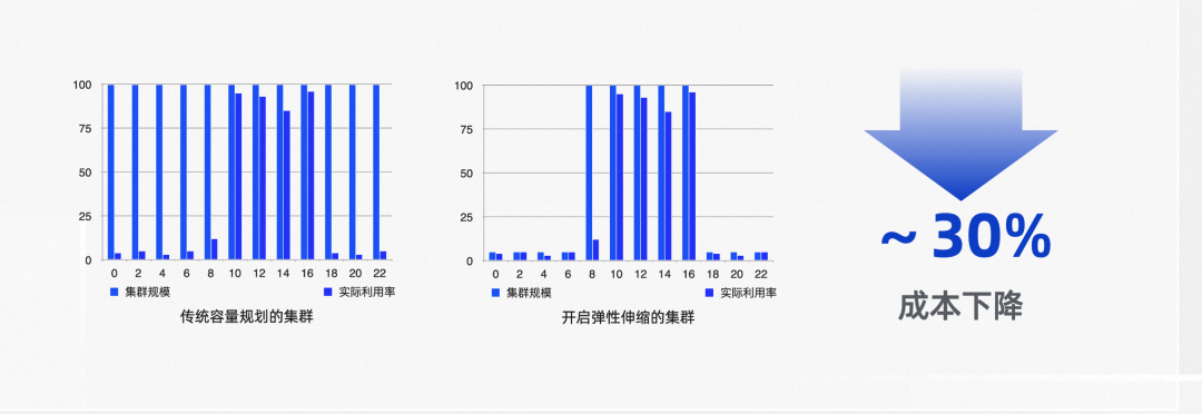 如何提升集群资源使用率呢,其实这个问题是要去解决规划容量和真实需求容量直接存在差异,这里边最重要的一个途径就是通过弹性来解决一些问题,实现成本优化。 传统的容量规划为了保证业务高峰稳定性,资源需要按照业务最高使用量进行常备,如左图所示,这种方案虽然保证了稳定性,但是资源利用率很低,成本浪费比较大。使用弹性伸缩后,资源容量曲线和实际业务资源需求的曲线贴合度增高,也就是我们追求的资源利用率有了明显的提升,从而整体成本也得到下降。