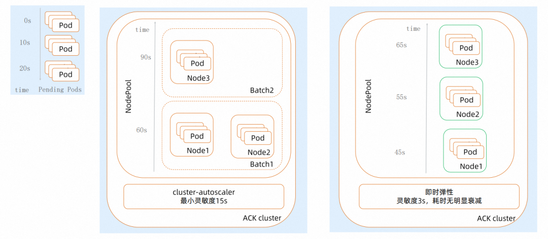 而即时弹性是基于事件的,Pods 出现不可调度的事件后即时弹性就会开始处理,并且支持同一节点池的并行扩容,这样就大大降低了触发扩容的耗时。我们这个例子中可以看到有 3 批 Pods,间隔是 10s,在 cluster-autoscaler 因为最后这个 20s 的这批 Pods 出现了跨批次,导致所有 Pods 耗时 90s 才能全部调度;而即时弹性,Pods 没有因为批次而延迟的问题,每一批基本耗时都可以稳定在 45s 上下。