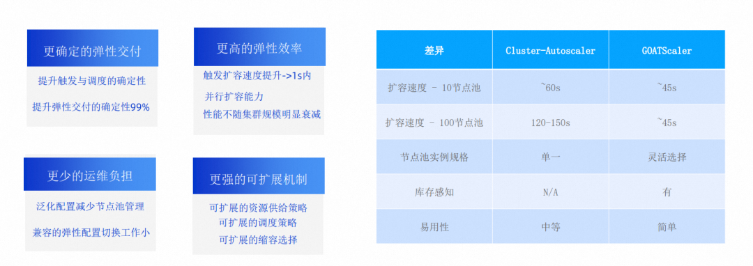 cluster-autoscaler 交付的不确定性、运维复杂性以及不够快的弹性速度、相对闭环的生态是很多开发者对于生产环境开启弹性的 4 个最大的顾虑。为了解决这些顾虑我们研发了第二代节点伸缩产品——即时弹性。