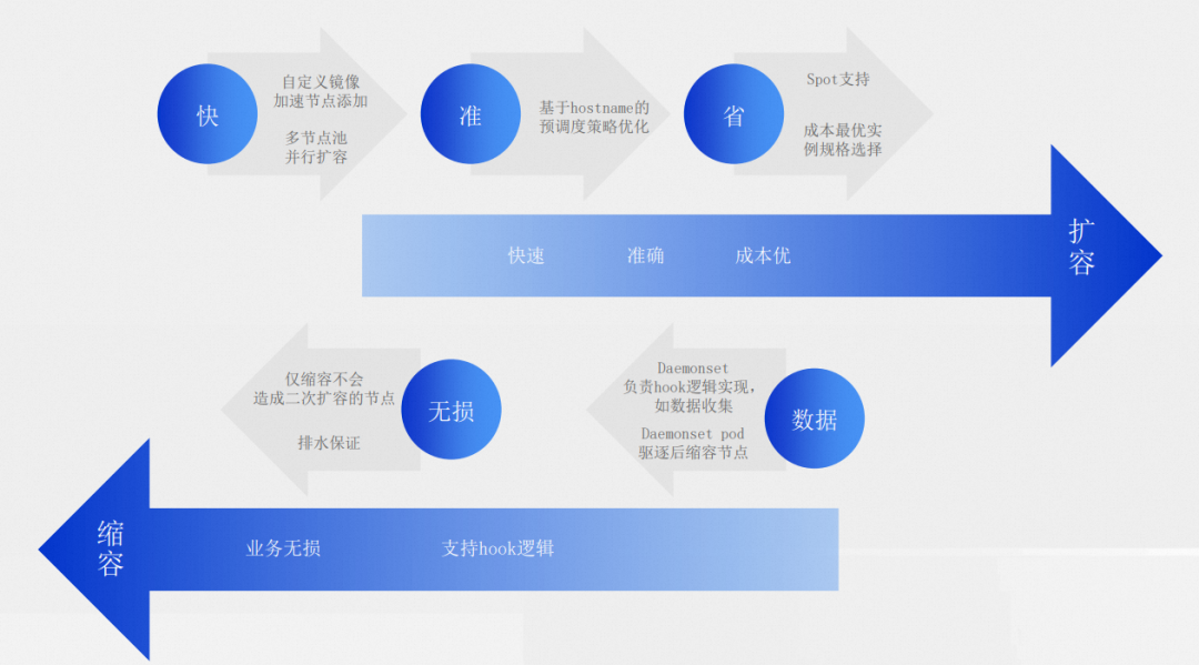 扩容方面,虽然业务负载层实现了冗余 Pods,但是在较大量的突增流量的情况下,仍然需要快速地供给资源。阿里云提供了预先加载节点组件镜像和用户镜像的自定义镜像方案和工具,帮助节省新节点扩容和业务启动过程中镜像拉取的时间。同时,还提供了多节点池并行扩容,让分属于不同节点池的业务的资源供给不互相影响,可以同时进行。除了快用户还需要基于节点 HostName 的打散,我们优化了弹性组件中基于 HostName 的预调度调度策略,让弹性决策更加准确。