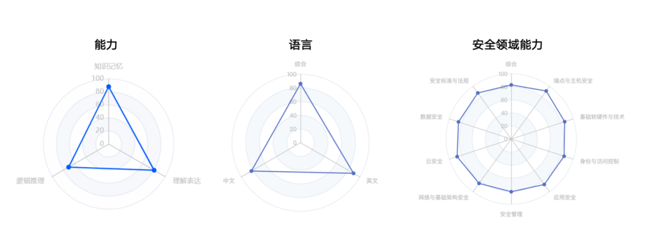 - 能力维度:从安全视角,支持大模型对安全知识的知识记忆能力、逻辑推理能力、理解表达能力的评估。