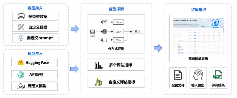 SecBench网络安全评测框架可以分为数据接入、模型接入、模型评测、结果输出四个部分,通过配置文件配置数据源、评测模型、评估指标,即可快速输出模型评测结果。