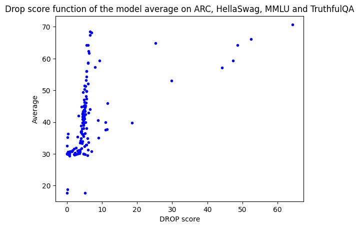 三周前,我们将 DROP 添加至开放 LLM 排行榜中,然后我们观察到预训练模型的 DROP F1 分数有个奇怪的趋势: 当我们把排行榜所有原始基准 (ARC、HellaSwag、TruthfulQA 和 MMLU) 的平均分 (我们认为其一定程度上代表了模型的总体性能) 和 DROP 分数作为两个轴绘制散点图时,我们本来希望看到 DROP 分数与原始均分呈正相关的关系 (即原始均值高的模型,DROP 分数也应更高)。然而,事实证明只有少数模型符合这一预期,其他大多数模型的 DROP F1 分数都非常低,低于 10。
