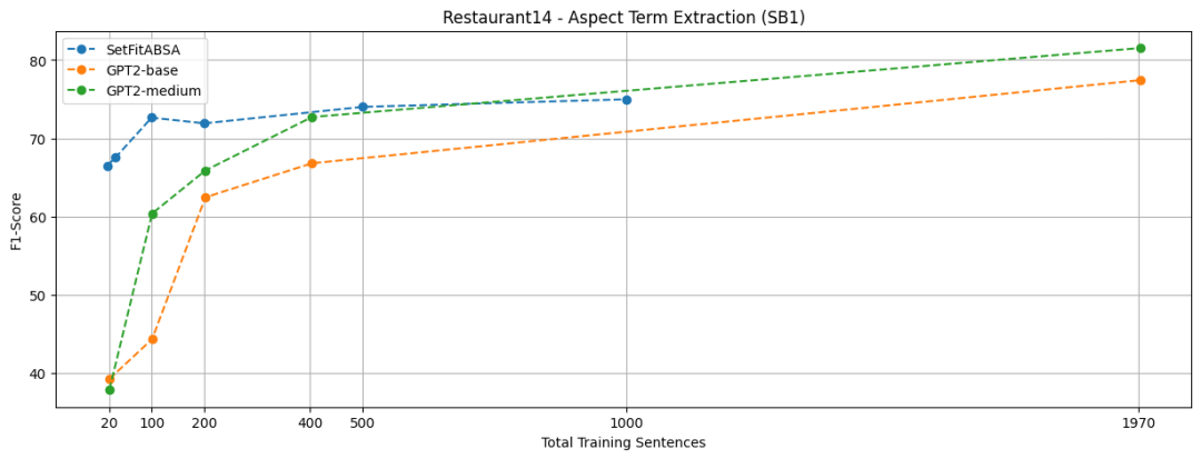 我们看到,当训练样本较少时,SetFitABSA 有明显优势,尽管它比 T5 小 2 倍,比 GPT2-medium 小 3 倍。即便是与 64 倍参数量的 Llama 2 相比,SetFitABSA 也能获得相当或更好的效果。