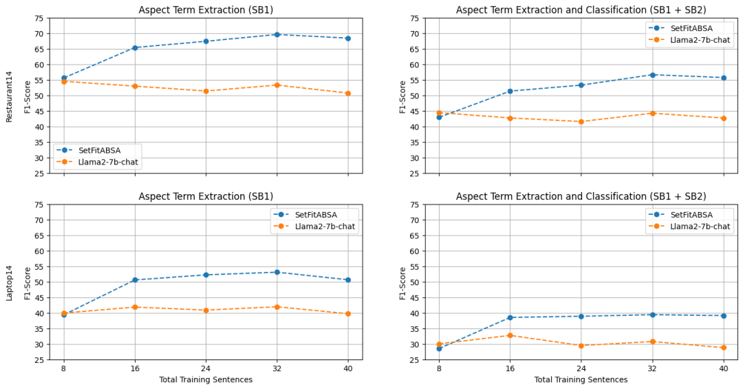 我们将 SetFitABSA 与 AWS AI 实验室 和 Salesforce AI 研究院 的最新成果进行比较,这两项工作主要采用了对 T5 和 GPT2 进行提示微调的方法以实现方面级情感分析。为了对我们的工作进行全面测评,我们还将我们的模型与基于上下文学习的 Llama-2-chat 进行了比较。