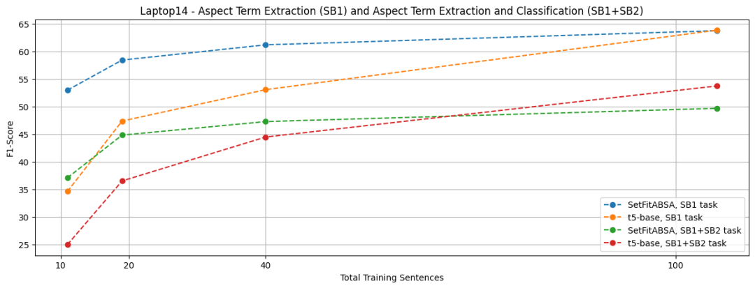 请注意,SB1 任务使用的 SetFitABSA 的参数量为 110M; SB2 任务再加上一个 110M 的模型。因此 SB1+SB2 时, SetFitABSA 的总参数量为 220M。