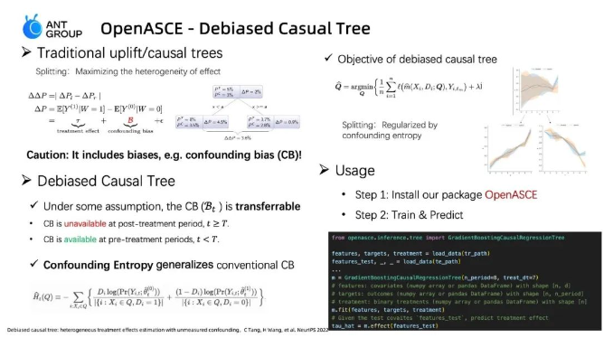 OpenASCE 实现的大规模分布式因果纠偏树可以在 4 小时内完成 1 亿样本的训练任务,是业界唯一的分布式因果提升树实现。此外,OpenASCE 还沉淀了 20 多个工业级因果学习算法,包括 15 个以上因果技术和深度学习结合的因果表征学习方法,有效降低了因果技术的工业应用门槛,在蚂蚁集团内部多个场景实现了规模化应用。