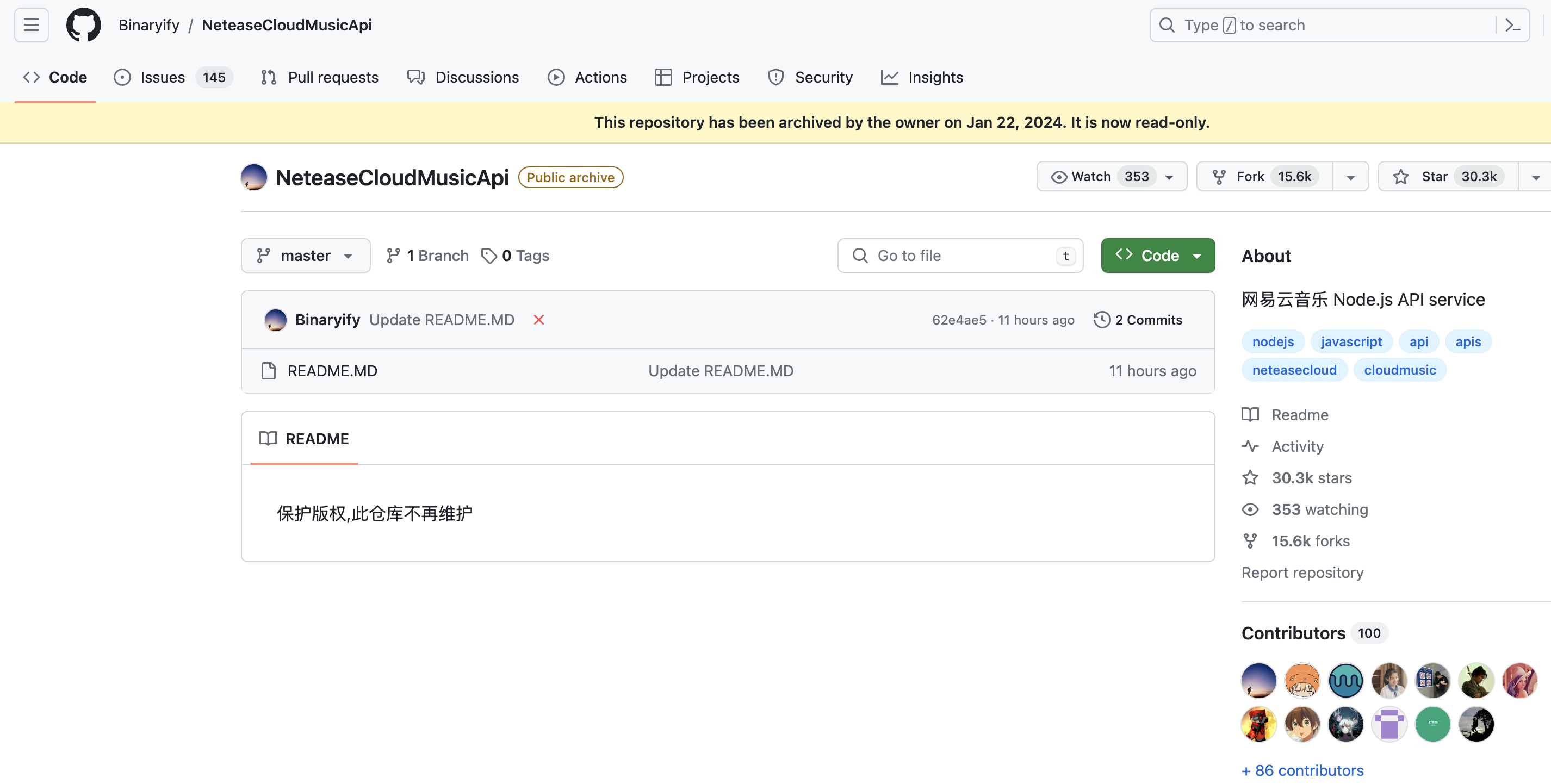 近日,NeteaseCloudMusicApi 的开源仓库清空了所有代码,以及 commit 记录等信息,并在 README 写道:“保护版权,此仓库不再维护”。