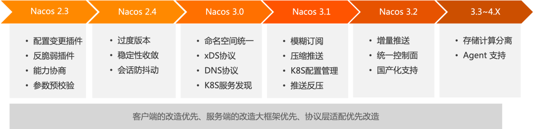 从 2021 年 3 月 2.0.0 正式版发布至今,2.X 版本已经走了接近2年时间,如今 2.3.0 版本发布,完成了大部分功能的插件化提炼,在之后的 2.3.X 版本中,会主要对当前版本的问题进行修复,并做出小范围的功能优化。同时对于 2.4.0 版本,会作为一个 Nacos3.0 的过度版本,对大量代码进行优化重构,在提升稳定性、健壮性的同时,提升易用性和可观测性,向 Nacos3.0 版本平稳过度。