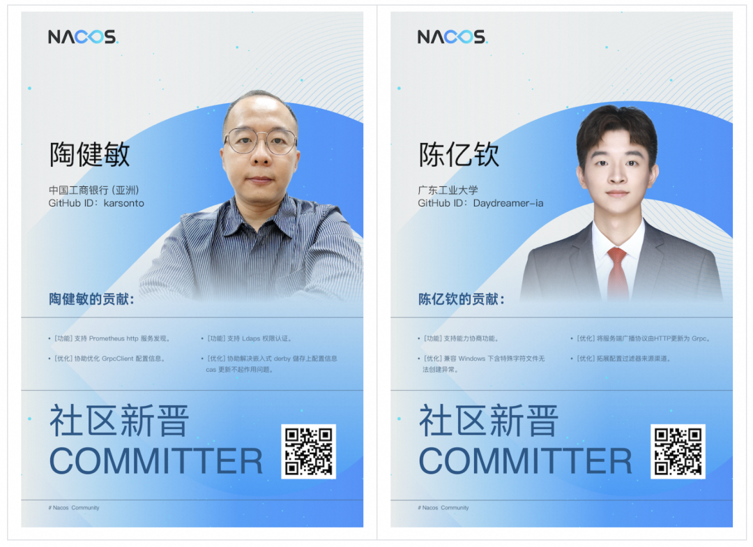 社区中新增了 2 位 Committer Karsonto [ 2] 和 Daydreamer-ia [ 3] 。同时,Nacos 社区又迎来了一位来自开源之夏的 Committer 同学 Daydreamer-ia 。