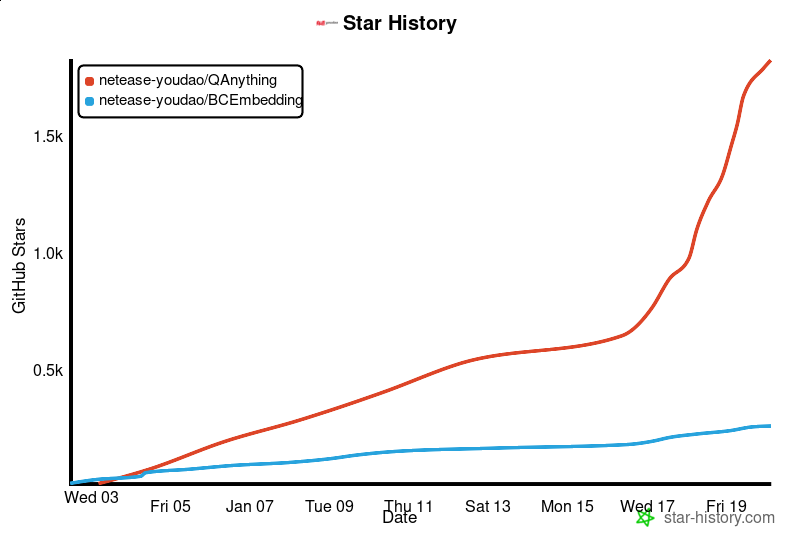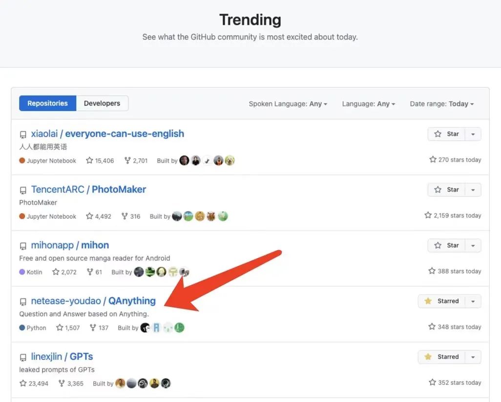 QAnything 受到广大开发者的密切关注,开源近两周,star迅速涨到接近2000,昨日QAnything进入到了github的trending版。