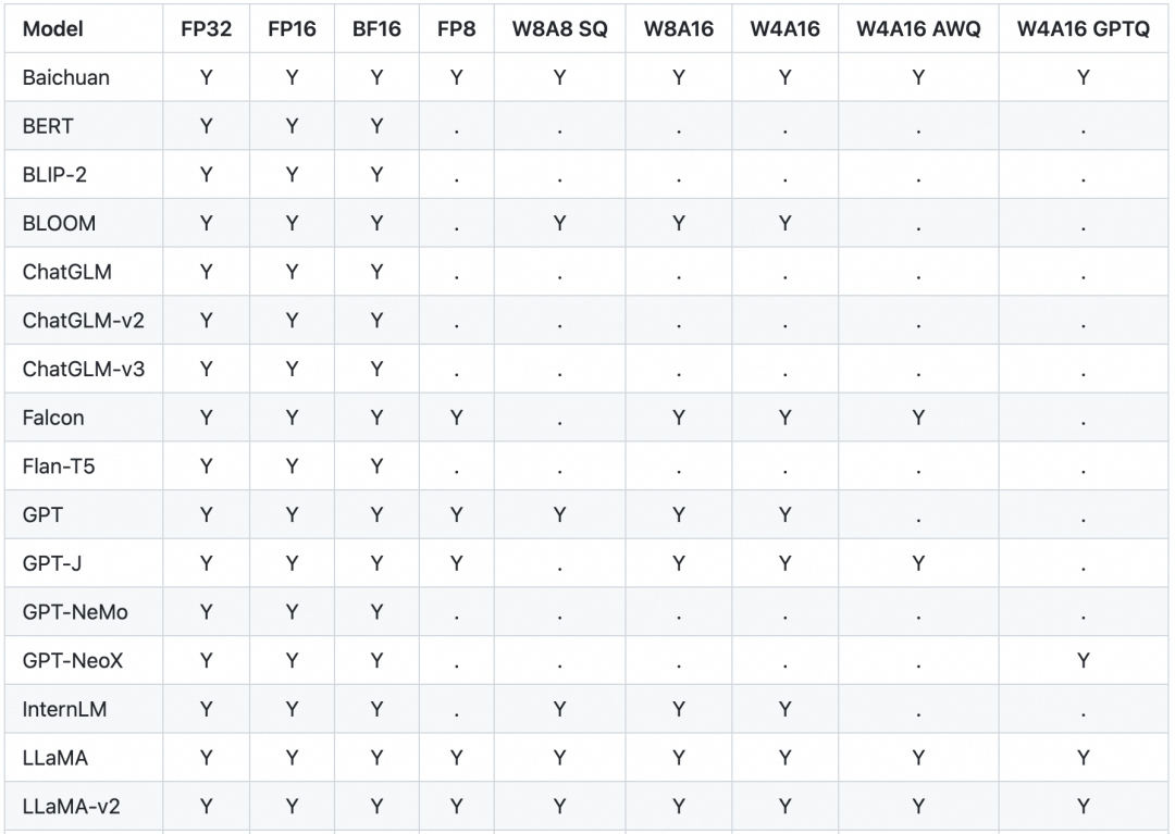 模型量化技术是通过降低原始模型的精度来减少模型推理时的 GPU 显存使用。TensorRT 支持多种模型的多种精度,以下列举了部分主流模型支持的量化精度。