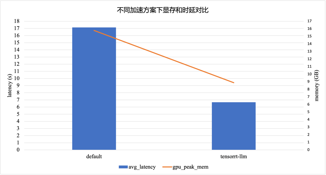 TensorRT-LLM 加速方案在采用 INT8 模型量化的情况下,相比于默认的 Baichuan2-7B-Chat 模型,显存峰值降低了 *43.8% *,时延降低了 61.1%。