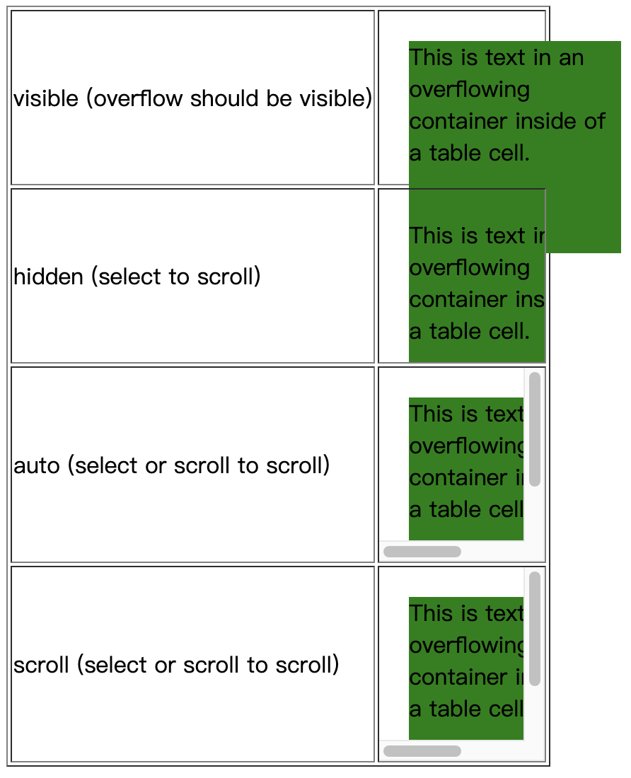 根据描述,具体错误是表格单元格无法正确处理内容“溢出”的情况,不支持 'hidden'、'auto' 和 'scroll' 属性。