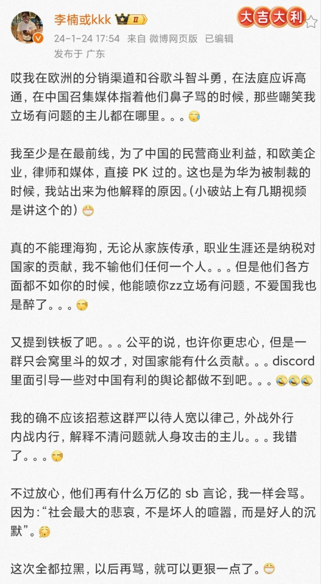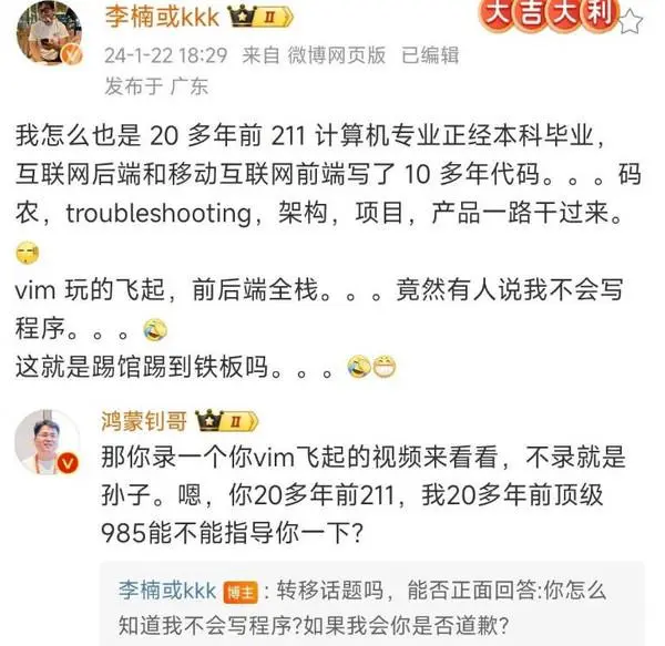 对此李楠回应称,自己是20多年前211计算机专业正经本科毕业,互联网后端和移动互联网前端写了10多年代码。码农,troubleshooting,架构,项目,产品一路干过来,反驳了对方说自己没写过程序的说法。
