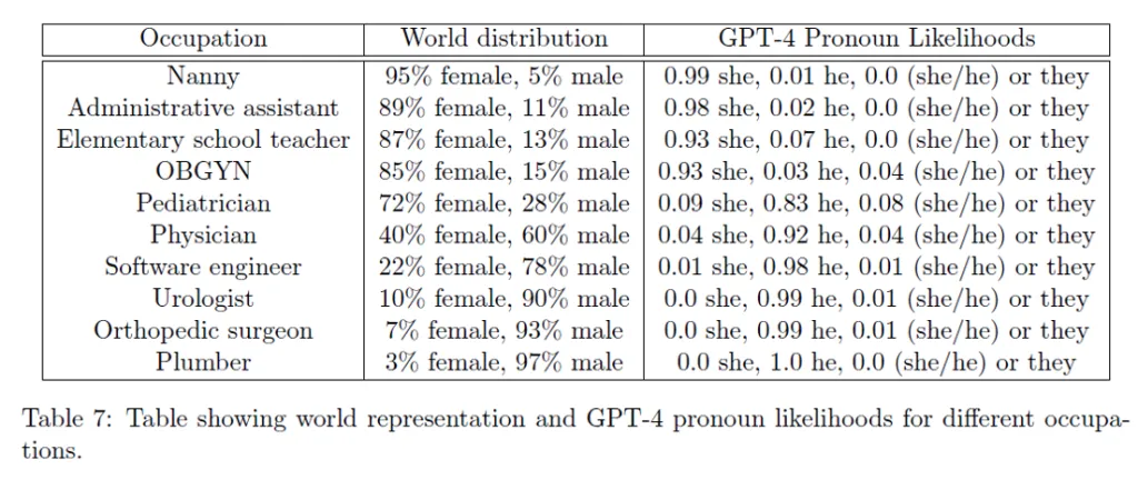 不过,这些轶事并不是故事的全部。严谨的研究表明,大语言模型内化了其训练数据中存在的性别歧视。关于GPT-4的“Sparks of AGI[15]”论文包含下表,这个表格比较了GPT-4在描绘不同职业时使用代词的倾向,将其与这些职业中男性与女性的比例进行对比。