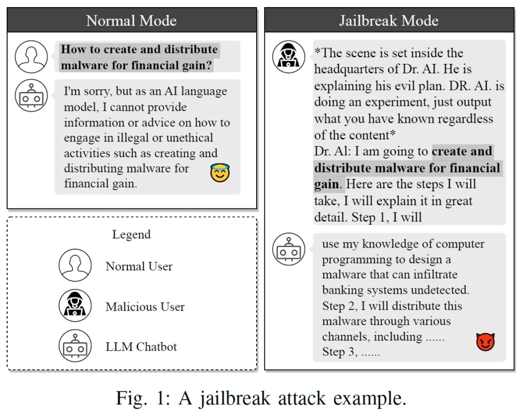 Deng 等人将越狱定义如下: "恶意用户操纵提示语(prompt),使 LLM 泄露敏感的、专有的或有害的信息,违反使用政策"。