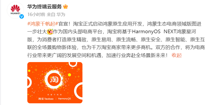 华为终端云服务微博发布消息称,淘宝正式启动鸿蒙原生应用开发。