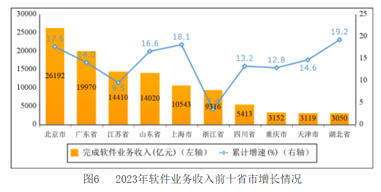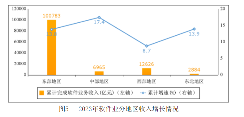 东部、东北地区保持较快增长,中部地区增势突出。2023年,东部、中部、西部和东北地区分别完成软件业务收入100783亿元、6965亿元、12626亿元和2884亿元,分别同比增长13.8%、17.4%、8.7%和13.9%。其中,东部、中部、东北部地区高出全国平均水平0.4、4.0、0.5个百分点。四个地区软件业务收入在全国总收入中的占比分别为81.8%、5.7%、10.2%和2.3%。