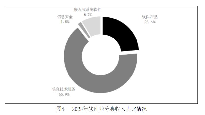 信息技术服务收入较快增长。2023年,信息技术服务收入81226亿元,同比增长14.7%,高出全行业整体水平1.3个百分点,占全行业收入比重为65.9%。其中,云服务、大数据服务共实现收入12470亿元,同比增长15.4%,占信息技术服务收入的15.4%,占比较上年同期提高0.5个百分点;集成电路设计收入3069亿元,同比增长6.4%;电子商务平台技术服务收入11789亿元,同比增长9.6%。