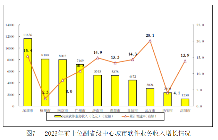 中心城市软件业务收入稳步增长,利润总额增速大幅提高。2023年,全国15个副省级中心城市实现软件业务收入59604亿元,同比增长11.2%,增速较上年同期提高1.2个百分点,占全国软件业的比重为48.4%;实现利润总额7936亿元,同比增长15.6%,增速较上年同期提高13.2个百分点。其中,哈尔滨、武汉、大连、深圳、济南、青岛、厦门和沈阳软件业务收入同比增速超过全行业整体水平。
