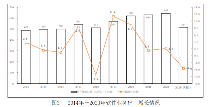 软件业务出口小幅下滑。2023年,软件业务出口514.2亿美元,同比下降3.6%。其中,软件外包服务出口同比增长5.4%。