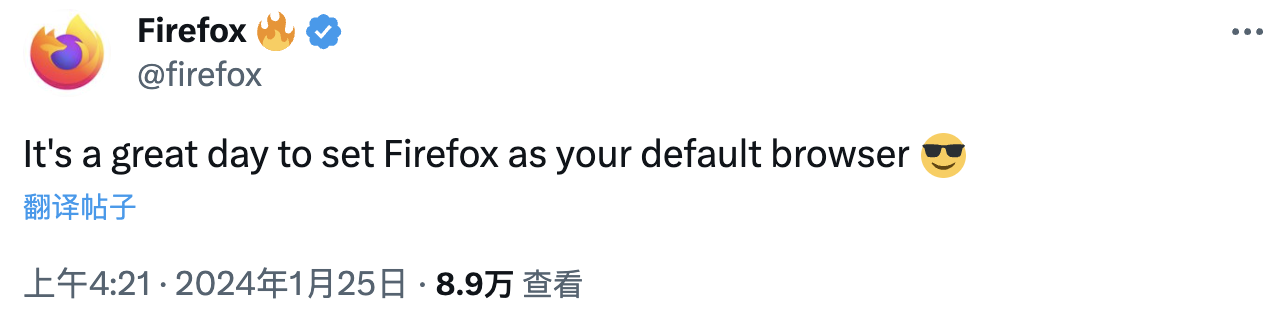 Firefox 当即发推表示:“今天是将 Firefox 设置为默认浏览器的好日子。”