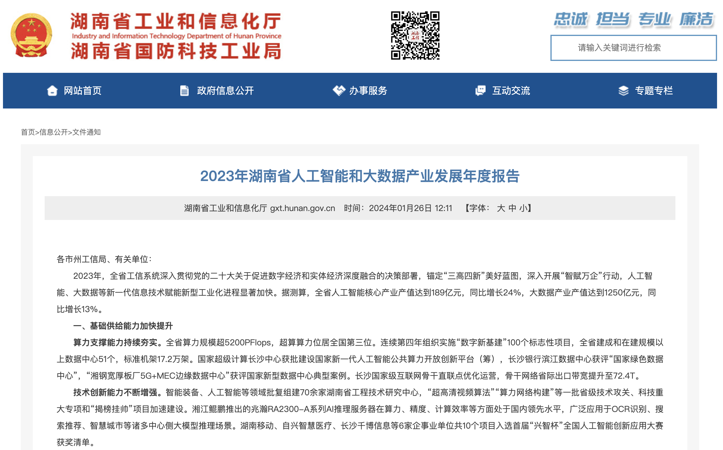 湖南省工业和信息化厅今日发布了《2023年湖南省人工智能和大数据产业发展年度报告》。报告提到,2023年湖南省人工智能核心产业产值达到189亿元,同比增长24%,大数据产业产值达到1250亿元,同比增长13%。