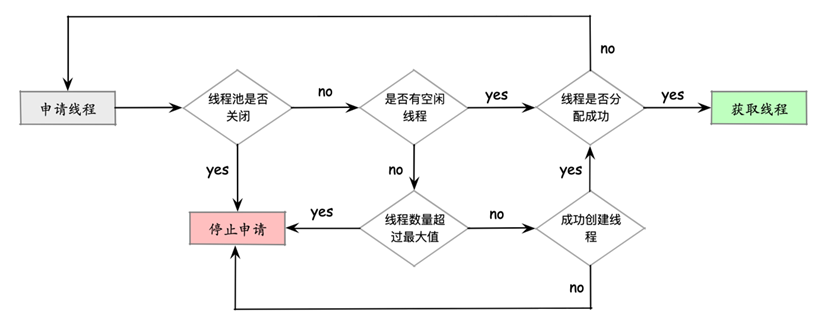 ThreadPool 接口申请 Thread 资源时,首先会检查 ThreadPool 是否已经关闭,如果已经关闭,则停止本次资源申请。如果 ThreadPool 状态正常,检查 wait_threads 中是否为空,即 ThreadPool 是否存在可用的线程。若存在就尝试获取一个 Thread,将对应 thread_id 返回给申请者;若不存在,检查当前 ThreadPool 线程数量是否超过了设定的最大值,若超过,则返回申请失败。若没有超过,则尝试继续初始化部分 Thread,将对应的 thread_id 放入到 wait_threads 中,以供用户进行申请及使用。