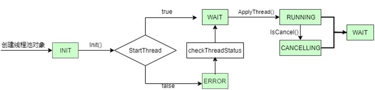 ThreadPool 在其生命周期内的状态转移过程如图 4 所示,ThreadPool 对象创建完成后,其状态设定为 INIT,此时 ThreadPool 尚无法对外提供服务。在对 ThreadPool 执行完毕 InitThreadPool() 方法后(ThreadPool 对象只能被初始化一次)状态先转移成 INITIALIZAING;ThreadPool 中完成了 Thread 对象的创建,具备了对外提供服务的条件,此时状态转移成 RUNNING。