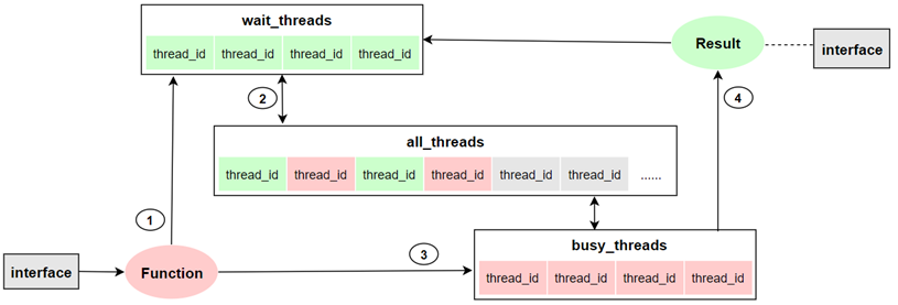 当 wait_threads 不为空时,为请求方提供一个 Thread 用于各项操作并返回 thread_id;当 wait_threads 中为空且线程池中线程数量没有达到上限时,尝试再次初始化部分 Thread,并将 thread_id 放入到 wait_threads (list)中以供上层调用。ThreadPool 模块负责处理 Thread 在创建与回收过程中的异常。