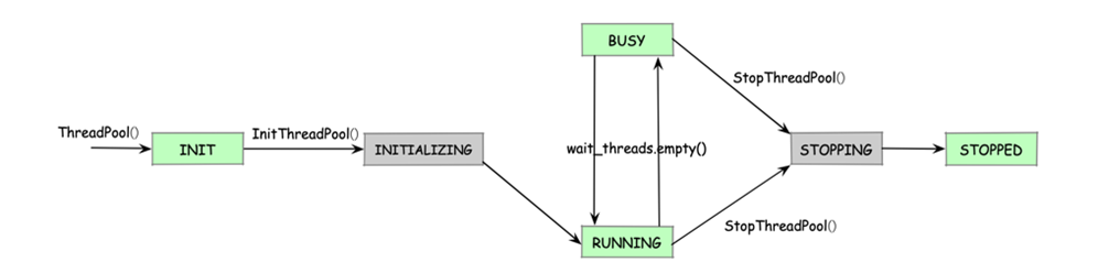 不管 ThreadPool 对象状态处于 RUNNING 还是 BUSY,当该对象的 StopThreadPool() 方法被调用时,ThreadPool 对象则需安全退出,ThreadPool 对象状态先转移至 STOPPING,等到 ThreadPool 对象停止对外提供服务,Thread 正在执行中的操作等待同步完成,ThreadPool 对象状态先转移至 STOPPED。其中, INITIALIZAING、STOPPING 状态为过渡状态。