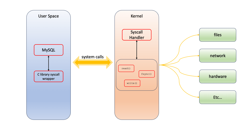 要操作文件,MySQL 和任何其他软件都必须调用 Syscalls。每当进程需要系统资源时,它都会通过 Syscalls 向内核发送对该资源的请求。从较高层次来看,系统调用是内核向用户应用程序提供的“服务”。它们类似于库 API,被描述为具有名称、参数和返回值的函数调用。下图是此过程的高级说明: