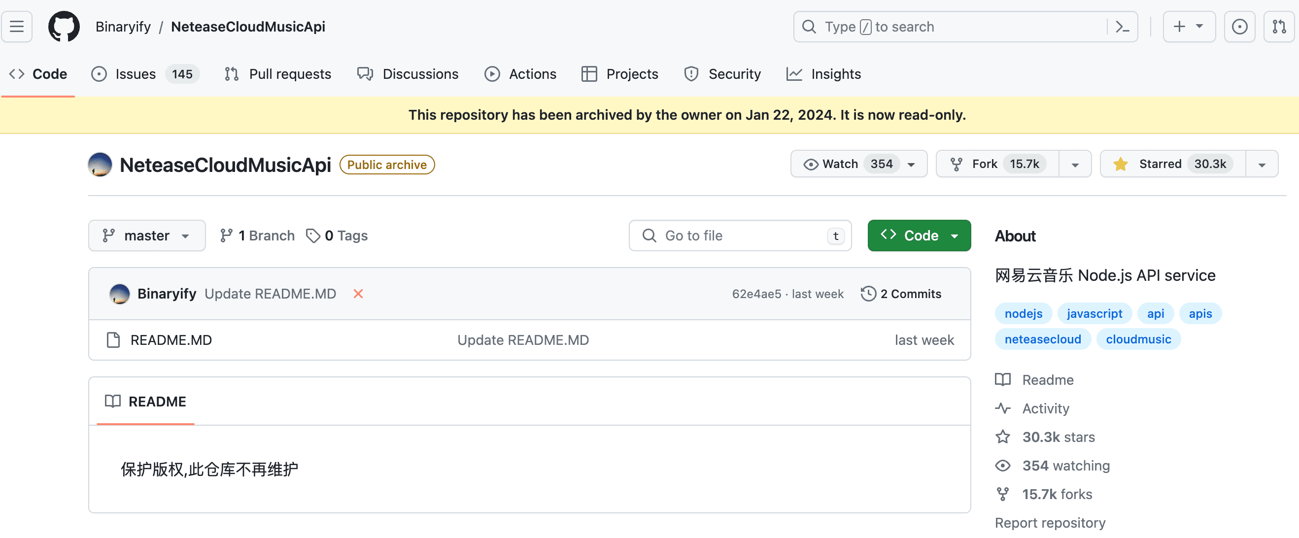 还有,国内的网易云音乐 API 开源项目:NeteaseCloudMusicApi,被网易云音乐公司起诉侵权,要求删除。该项目是作者用 Node.js 封装的第三方网易云音乐 API,很多网易云音乐的开源客户端都依赖它,目前该项目已删库,仅留下一句:“保护版权,此仓库不再维护”。