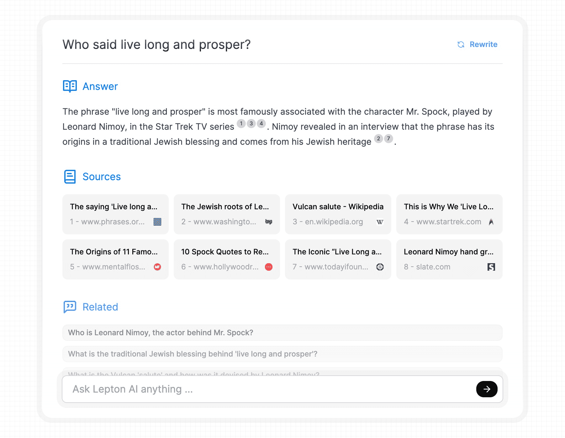 小插曲,在贾扬清博士放出演示地址后,AI 搜索引擎 Perplexity 创始人认为这款产品参考了自家的 UI 界面设计,贾扬清博士也对此做出回应,表示他无意进入这个市场,该项目更多是作为演示和宣传自家 LeptonAI 云服务的一部分,并且从一开始就计划开源该项目。(然后这个项目就开源了)