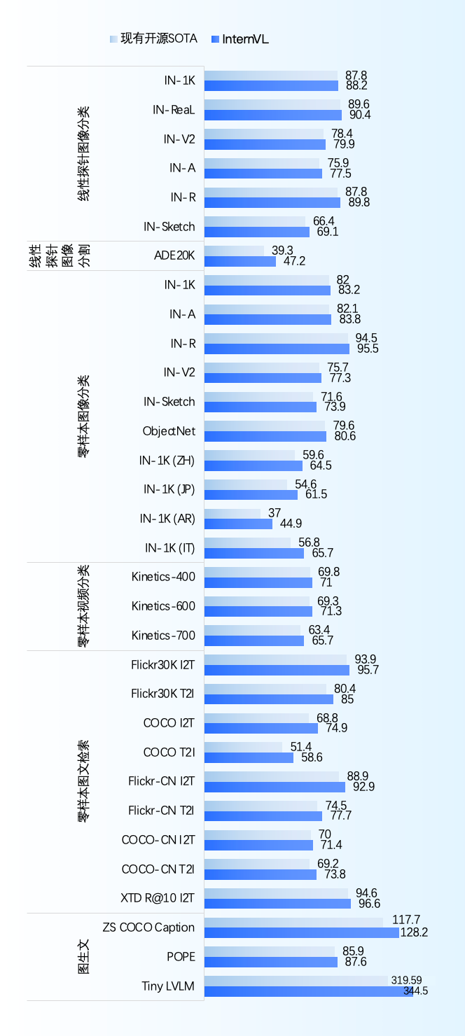 在视觉感知、图文检索、图文多模态生成和对话等30余个视觉基准测试上,InternVL-6B取得了开源社区的最优性能,超过了Meta、谷歌、微软、LAION等机构的同类开源模型。