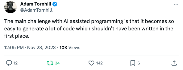 GitHub 声称,使用 Copilot 编写代码的速度提高了 55%。但问题是,有些本不应编写的代码怎么办?正如《Clean Code: A Handbook of Agile Software Craftsmanship》的作者 Robert Martin 所说,代码的阅读时间是编写时间的十倍。更快地写出低质量代码,意味着后续阅读代码的人将面临更多困难。
