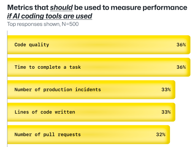 但当问题转向“在使用 AI 时,应以哪些指标评估你的工作?”时,他们的关注点发生变化,“代码质量”成为了最关注的问题,而“生产事件数量”上升为第三大关注点: