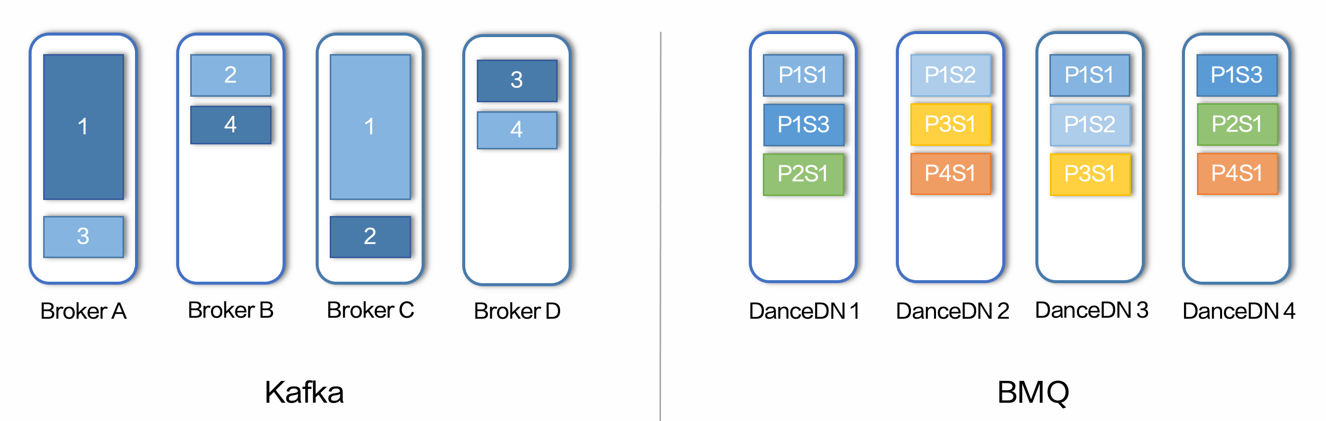 在分层之后数据存储模型上的优势,主要体现在 BMQ 中,一个 Partition 的数据会和 Kafka 一样被切分为若干个 Segment,Kafka 中的这些 Segment 都会被存储在同一块磁盘上,而在 BMQ 中,因为数据存储在分布式存储中,每一个 Segment 也都被存储在存储池中不同的磁盘上。从上图中可以明显看出,BMQ 的存储模型很好的解决了热点问题。即使 Partition 间数据大小或访问吞吐差别很大,被切割成 Segment 后都能均匀地分散在存储池中。