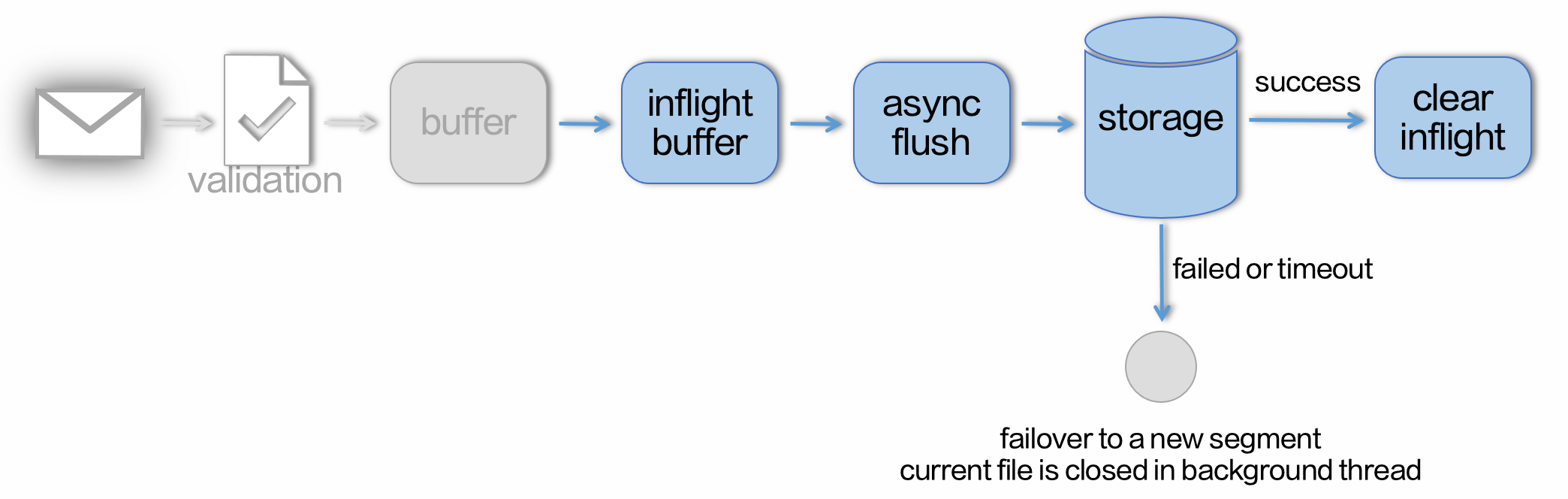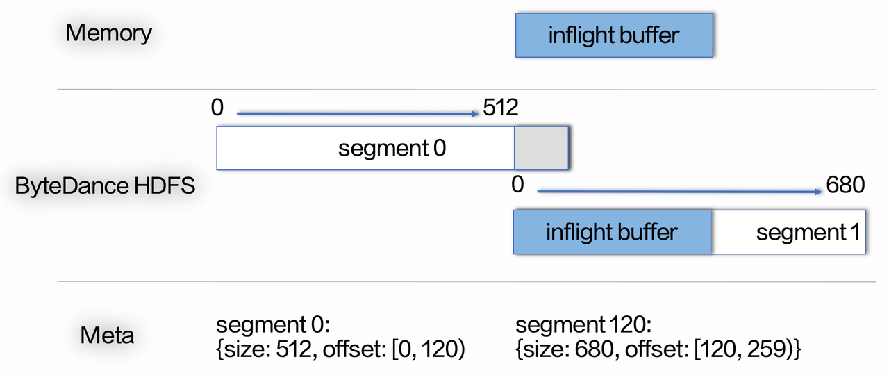 我们可以看到在状态集中有一个 Failover 节点,这个节点是 BMQ 降低分布式存储延时毛刺的关键。每一次写入 BMQ 会先将数据放入一个 Inflight Buffer 中,之后通过异步调用分布式存储的 Flush 接口持久化数据。若 Flush 在预期时间内返回成功,那么 Inflight Buffer 数据中的数据会被清除,同时返回给用户写入成功的回应。但若因为网络或者慢节点问题导致写入超时,那么 Broker 会直接创建一个新的 Segment 文件,将 Inflight Buffer 中的数据直接写入新的文件,并在后台异步将之前的 Segment 文件关闭。对于异步关闭的这个文件,元信息只会包含成功返回的数据长度,最后超时的部分则不会被记录,这样即使超时数据最终确实写入了分布式存储,也不会被用户读取造成数据重复,这一整个过程就是我们说的 Failover。