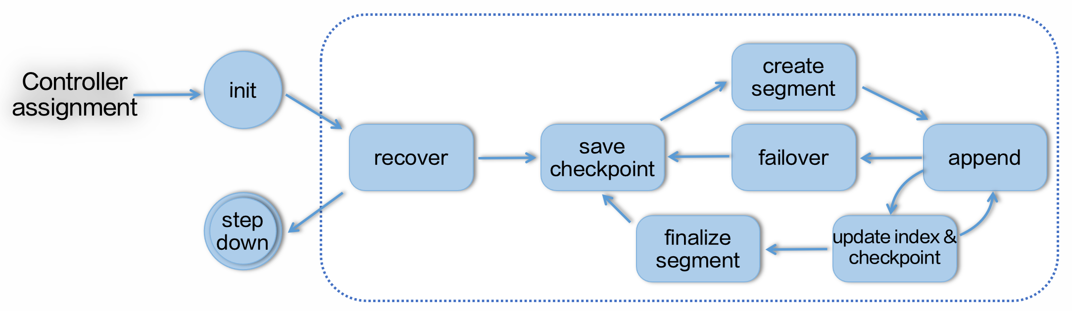 如上图所示,当一个 Partition 被调度到 Broker 上之后,便开始了它的生命周期。首先 Partition 会进行 Recover,即从上一个 Checkpoint 恢复数据,并将最终结果保存,这样做是避免因意外宕机导致用户已经写入成功的数据丢失。之后 Partition 便会创建一个新的 Segment 开始写入数据,期间会写入索引等信息。当文件长度到达配置长度,或者文件写入持续到达配置时间后会被关闭,存储相关元信息,并开启一个新的 Segment 写入。依次循环,直到 Controller 将 Partition 从这个 Broker 调度走,或发生异常 Partition 退出。