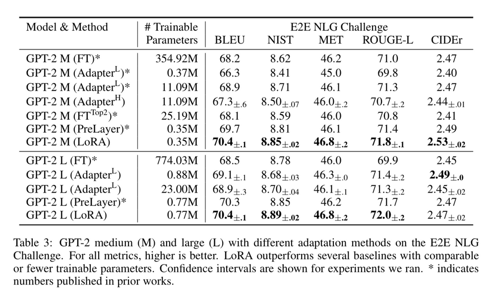 即使可训练参数的数量要小得多,但是当应用于 GPT-2 时,性能超过了许多 Adapter 和 PreLayer 方法。