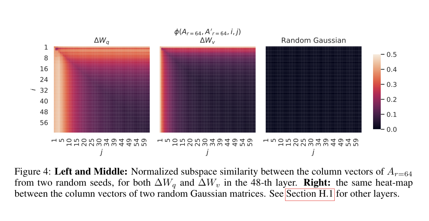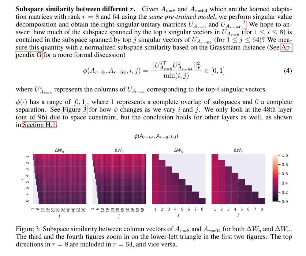 (译者注:"Subspace Similarity"指的是在线性代数中,两个向量空间之间的相似性。)他们使用奇异值分解来研究模型中不同子空间之间的相似性。他们发现,在观察模型中的不同子空间时,直到维度为1时,这些子空间之间的相似性仍然很高。这可能对于理解为什么较低秩的模型表现更好具有重要意义。