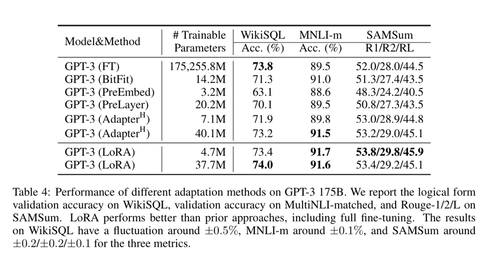 虽然 LoRA 具有更高的训练吞吐量,而且没有额外的推理延迟,但其性能与微调(fine-tuning)相当,甚至更好。