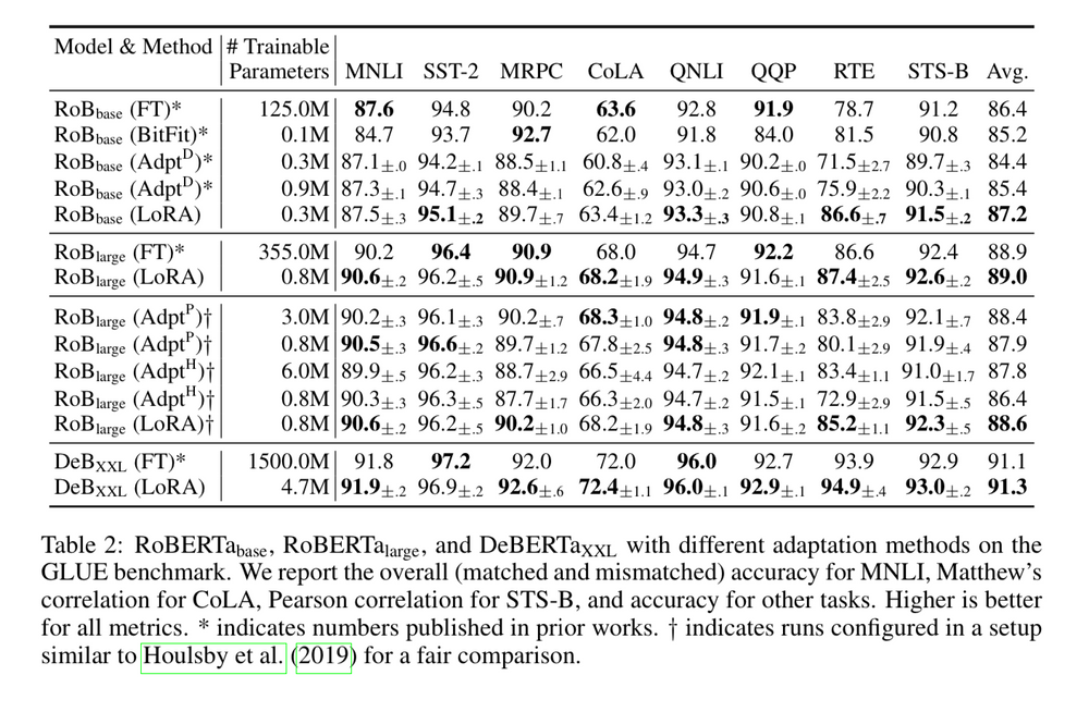 论文评估了 LoRA 在 RoBERTa、DeBERTa 和 GPT-2 上的下游任务性能,然后将其扩展到了 GPT-3。