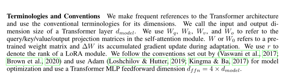 在本例中将 LoRA 应用于 Transformer 架构。因此,下一节一起来了解有哪些变量,分别代表着什么。