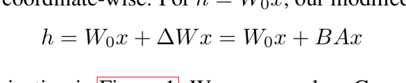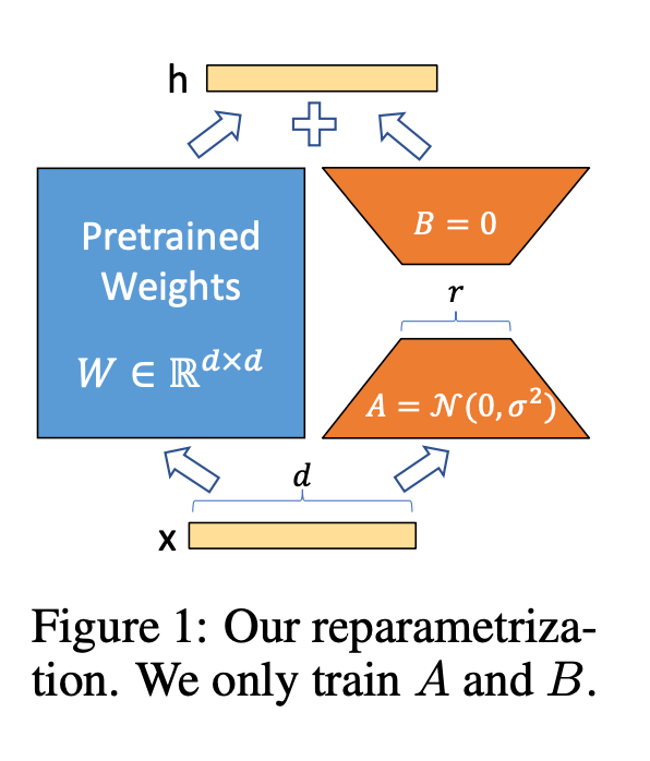他们对 A 从高斯分布中随机选择初始值来初始化矩阵中的元素,并将矩阵 B 初始化为零,这样在训练开始时,矩阵 B 乘以矩阵 A 的结果为零。