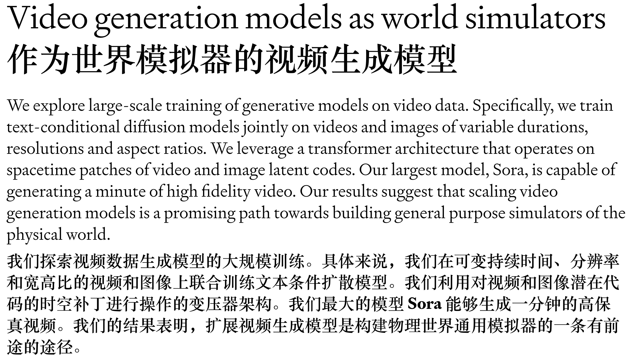 OpenAI 在技术报告介绍道,他们将 Sora 视频生成模型视作世界模拟器。具体来说就是通过跨越不同持续时间、宽高比和分辨率的视频和图像,从而生成最高可达一分钟的高清视频。